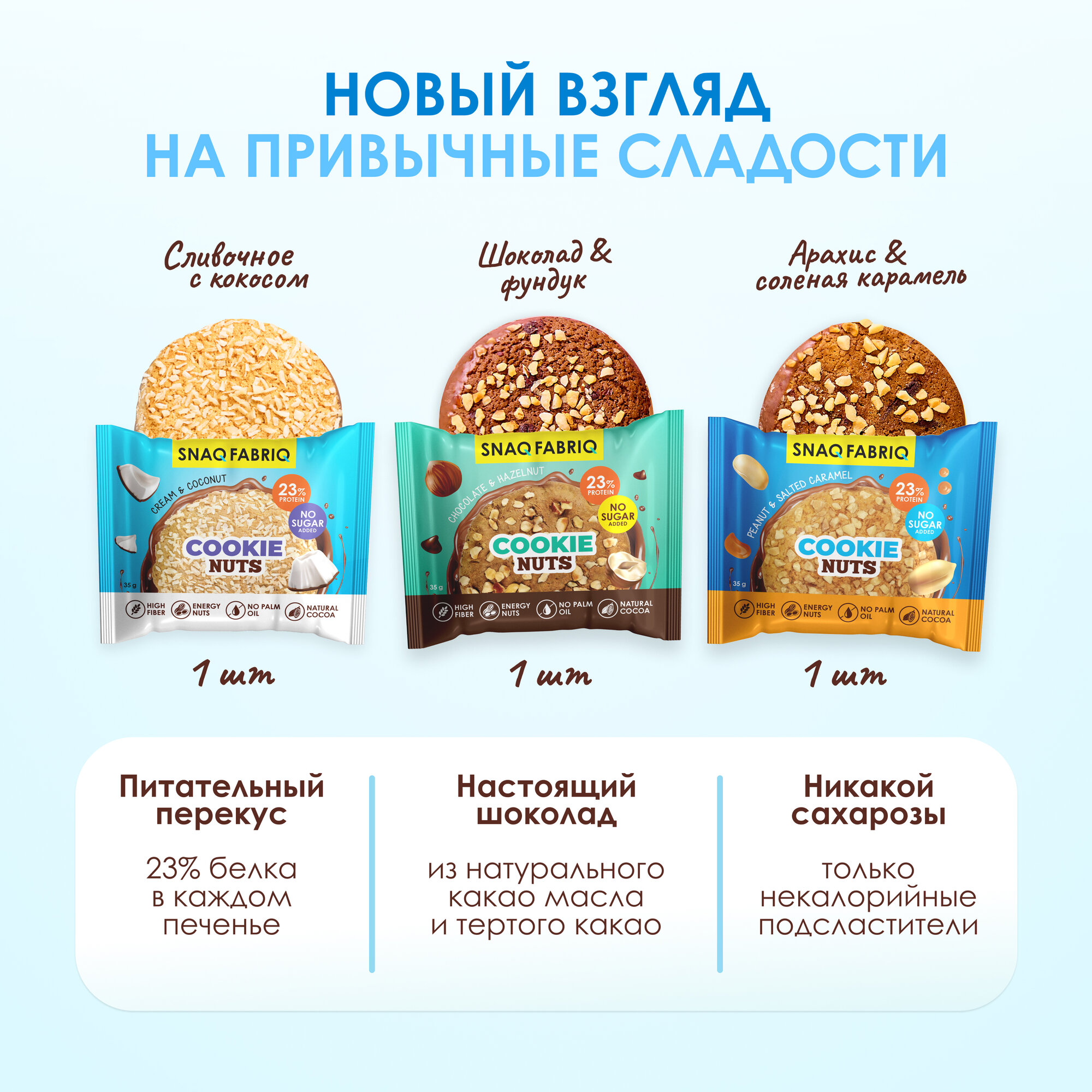 СохранитьSnaq Fabriq Cookie Nuts Протеиновое печенье без сахара низкокалорийное Ассорти mini, 3шт х 35г интересное: