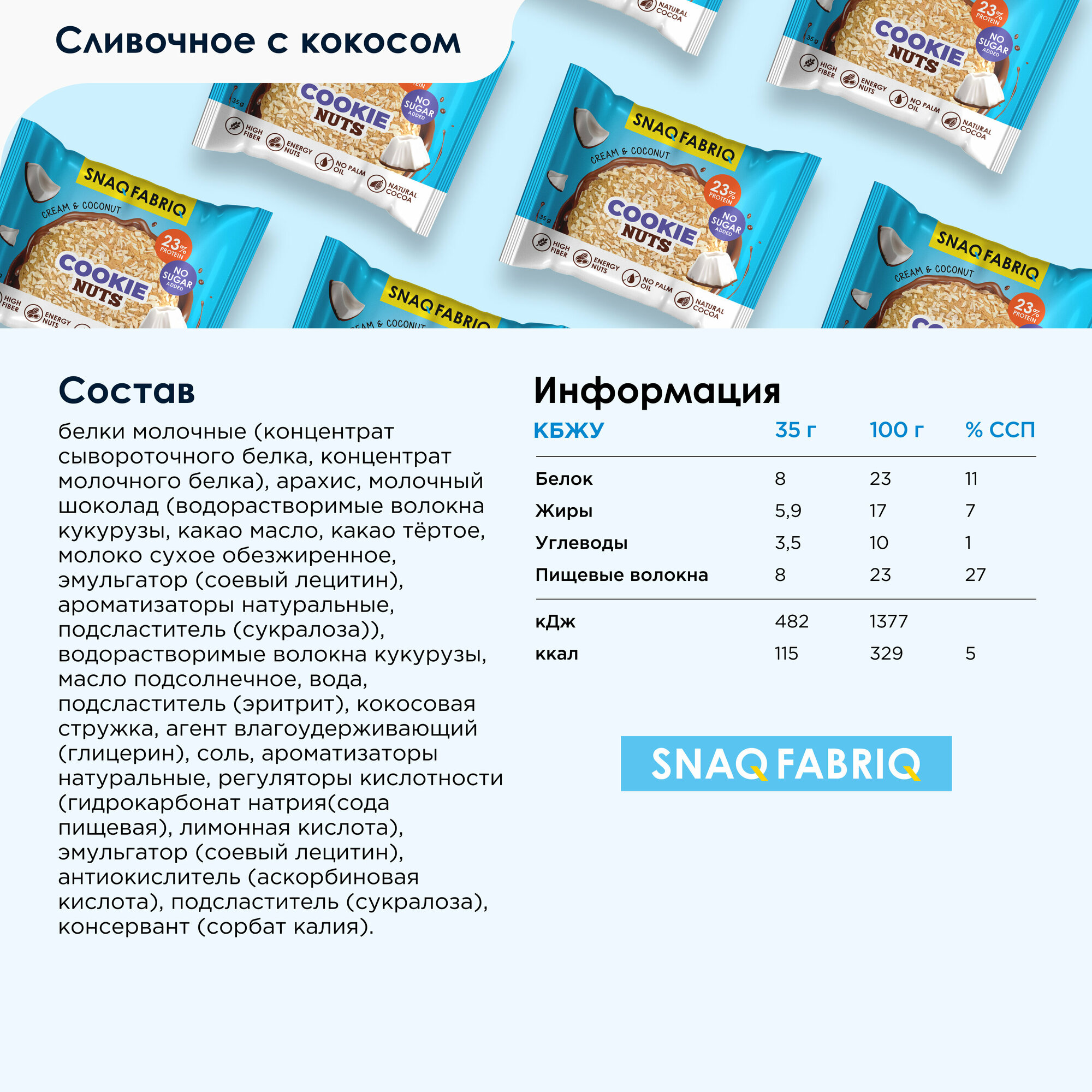 | Дополнительная информация | назначение: позволяет сделать перекус между приемами пищи; рекомендации по применению: в перерывах между едой/быстрый перекус, как дополнительный источник легкоусвояемых белков.; форма выпуска: печенье; калорийность порции: 110 ккал; содержание белка в порции: 7 г; размер порции: 35 г; состав: концентрат сывороточного белка, арахис, водорастворимые волокна кукурузы, олигофруктоза(пищевые волокна из цикория), масло кокосовое, вода, фундук, молочный шоколад (водорастворимые волокна кукурузы, какао масло, какао тертое, молоко сухое обезжиренное, эмульгатор (соевый лецитин), ароматизаторы натуральные, подсластитель - сукралоза), подсластитель(эритрит), какао порошок, агент влагоудерживающий (глицерин), соль, ароматизаторы натуральные, регуляторы кислотности (гидрокарбонат натрия(сода пищевая), лимонная кислота), эмульгатор(соевый лецитин), антиокислитель (аскорбиновая кислота), подсластитель (сукралоза), консервант (сорбат калия) |