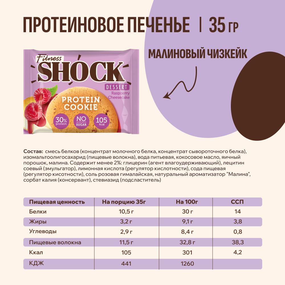 Купить Протеиновое печенье без сахара Dessert Малиновый чизкейк FitnesSHOCK 12 шт по 35 г.