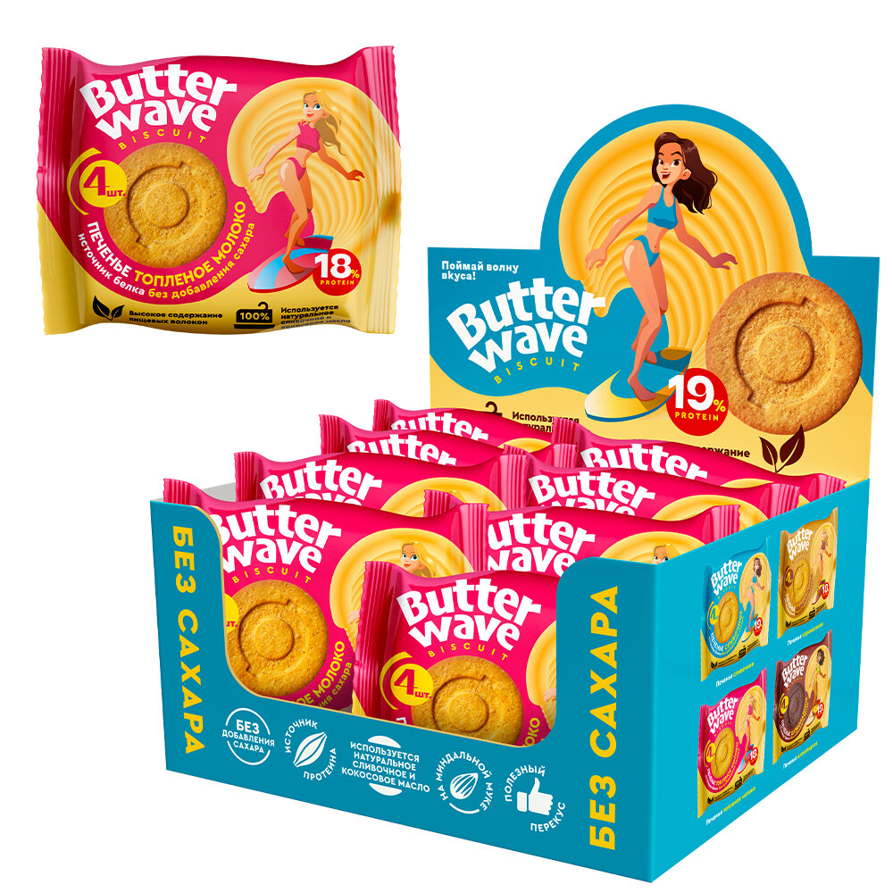 Купить Протеиновое печенье без сахара "Butter Wave" Топленое молоко , коробка 32штуки (8 уп по 4шт)