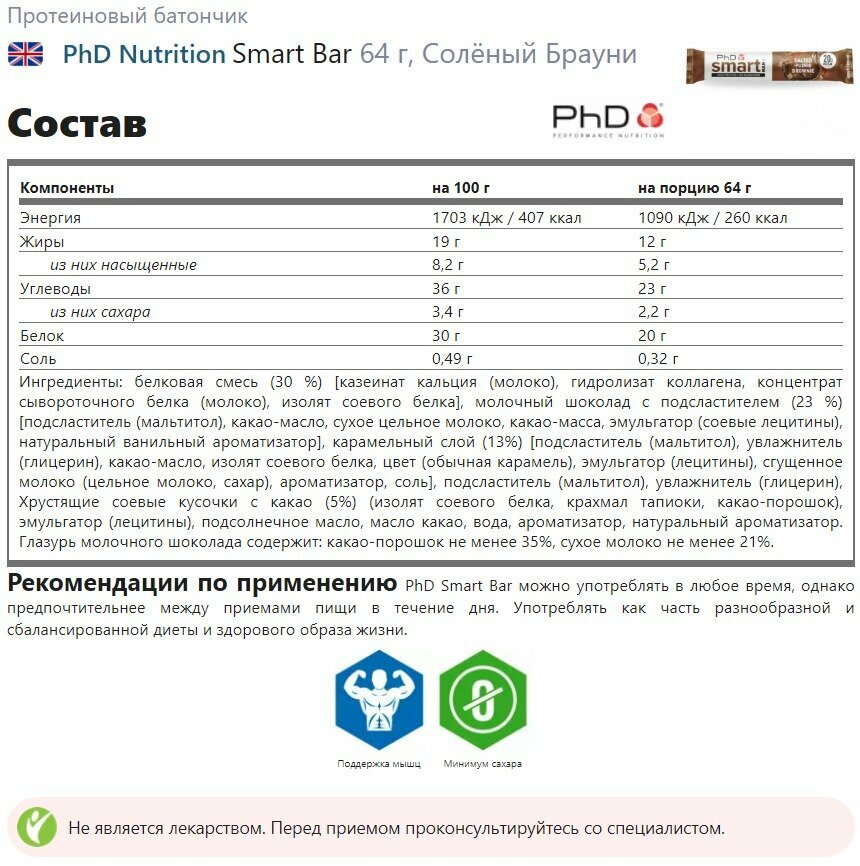 Протеиновый батончик PhD Nutrition Smart Bar 64 г, Солёный Брауни интересное: