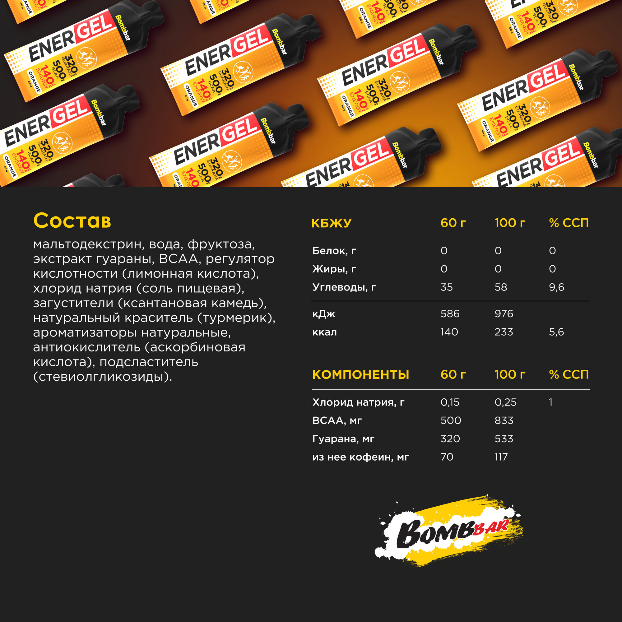 | Дополнительная информация | гуарана на 60 грамм: 320 мг (из неё кофеин 70 мг); BCAA: 500 мг; хлорид натрия на 60 грамм: 0.15 г; ограничения по использованию: индивидуальная непереносимость компонентов продукта; рекомендации по применению: не более 1 тюбика в день во время тренировок или занятий спортом, в периоды интенсивных нагрузок; форма выпуска: гель; состав: мальтодекстрин, вода, фруктоза, экстракт гуараны, ВСАА, регулятор кислотности (лимонная кислота), хлорид натрия (соль пищевая), загуститель (ксантановая камедь), натуральный краситель (турмерик), ароматизаторы натуральные, антиокислитель (аскорбиновая кислота), консервант (сорбат калия), подсластитель (сукралоза) |