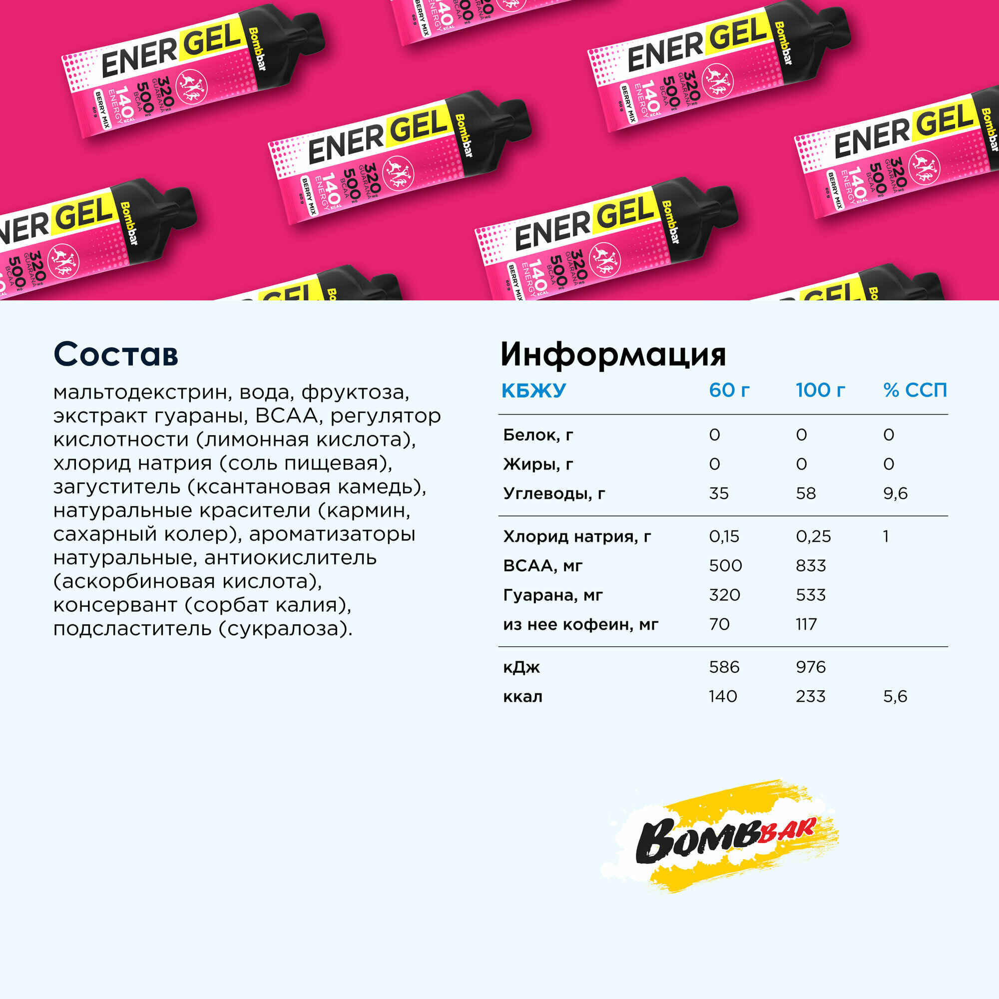 | Дополнительная информация | гуарана на 60 грамм: 320 мг (из неё кофеин 70 мг); BCAA: 500 мг; хлорид натрия на 60 грамм: 0.15 г; ограничения по использованию: индивидуальная непереносимость компонентов продукта; рекомендации по применению: не более 1 тюбика в день во время тренировок или занятий спортом, в периоды интенсивных нагрузок; форма выпуска: гель; состав: мальтодекстрин, вода, фруктоза, экстракт гуараны, ВСАА, регулятор кислотности (лимонная кислота), хлорид натрия (соль пищевая), загуститель (ксантановая камедь), натуральный краситель (турмерик), ароматизаторы натуральные, антиокислитель (аскорбиновая кислота), консервант (сорбат калия), подсластитель (сукралоза) |
