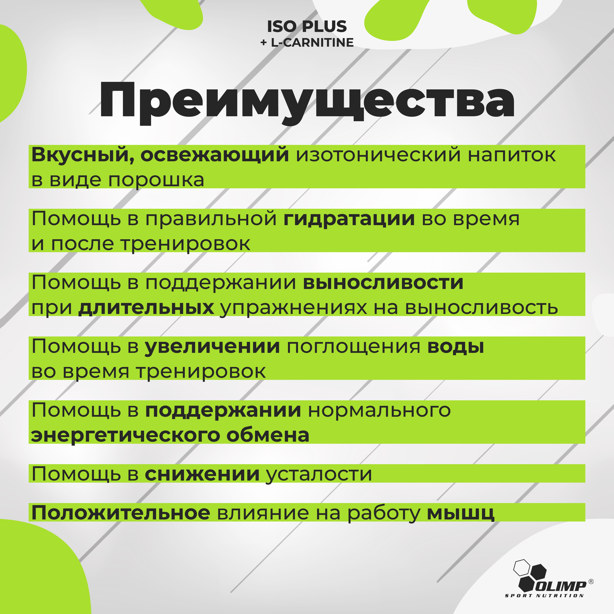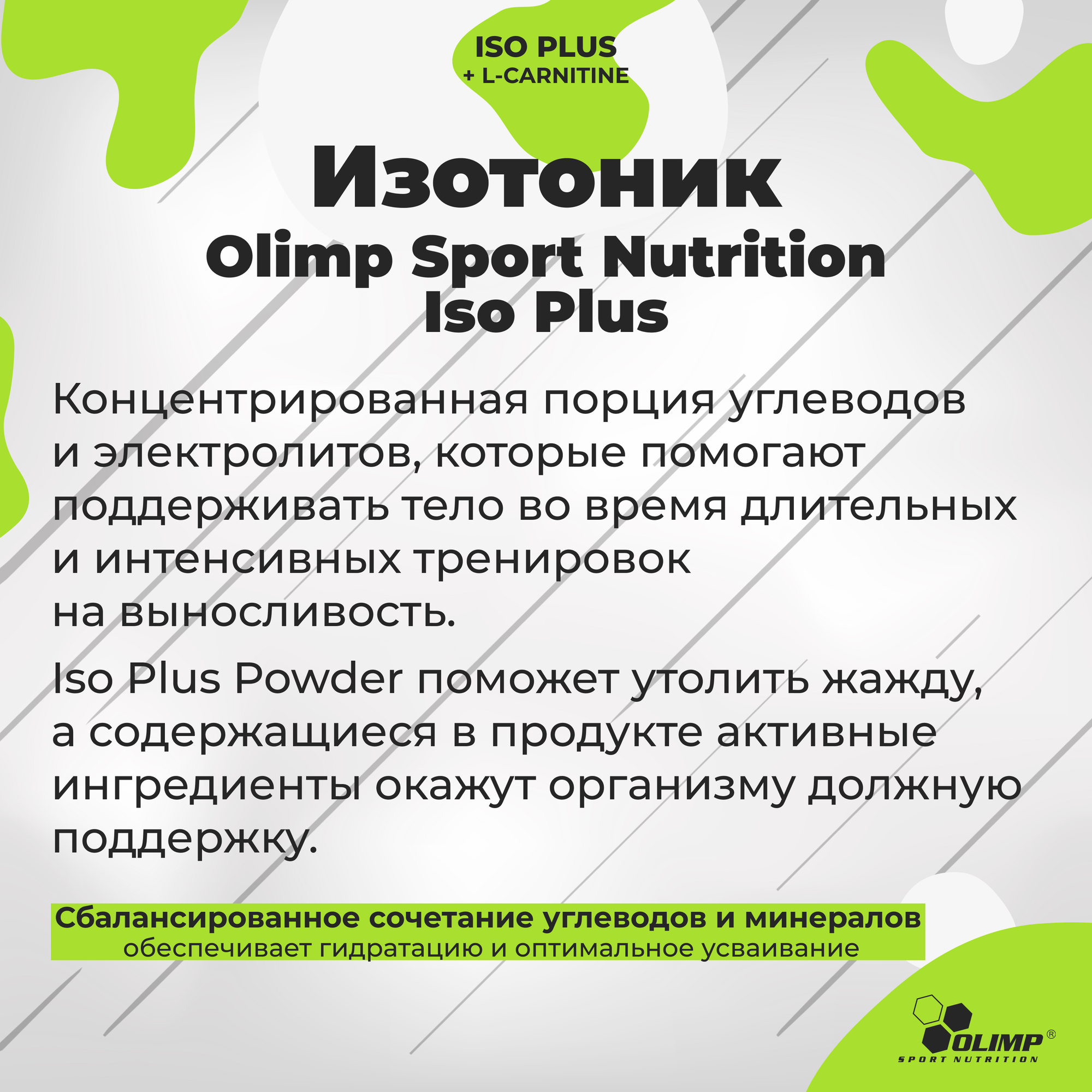 | Дополнительная информация | Вкусный, освежающий изотонический напиток в виде порошка; Положительное влияние на работу мышц (витамин D) |