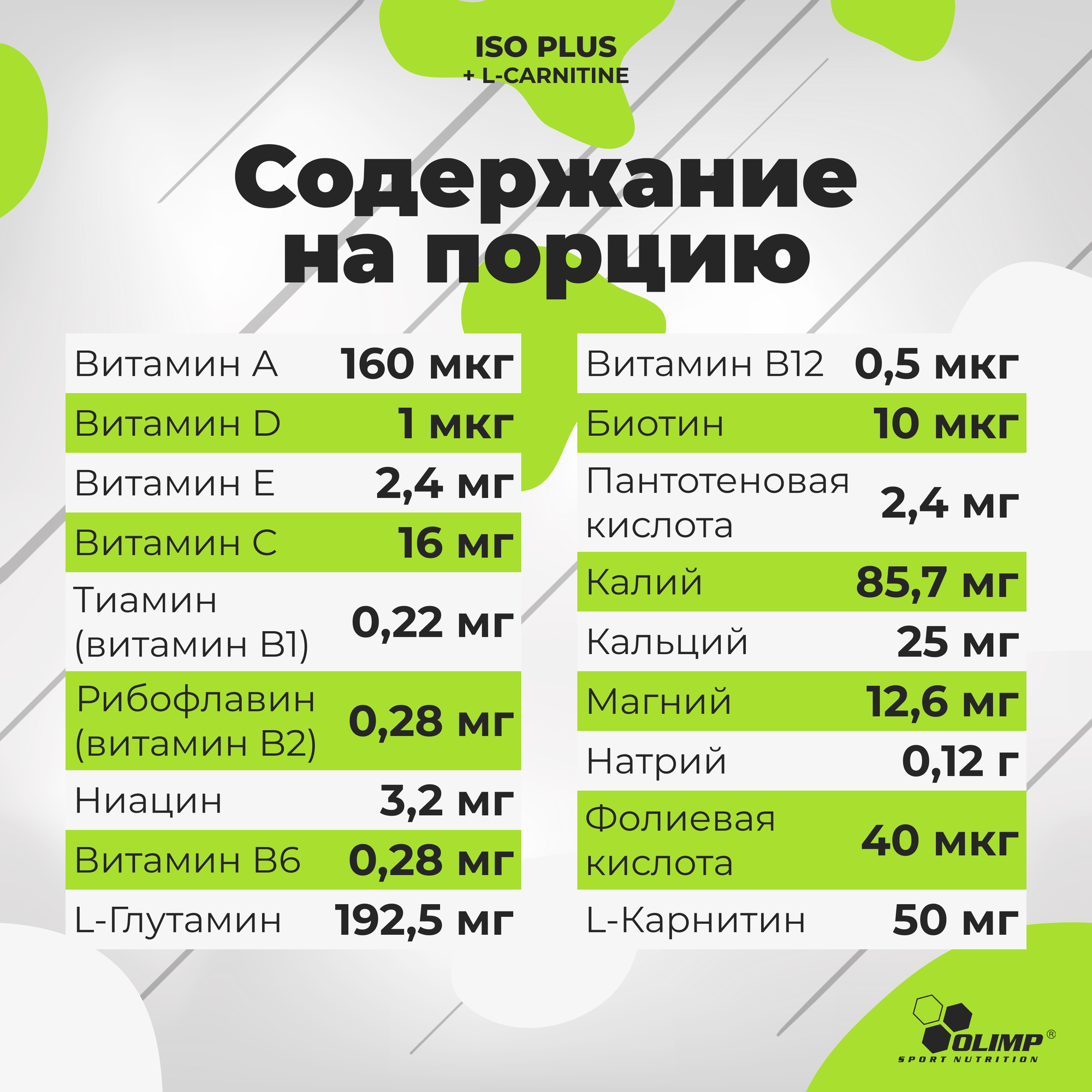 | Основные ингредиенты | L-глютамин / L-карнитин / витамины и минералы |
