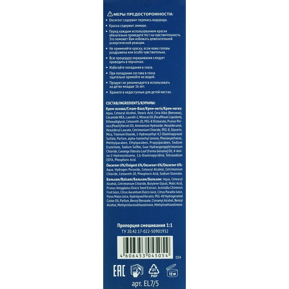 | Дополнительная информация | тест на чувствительности: приготовьте смесь из небольшого количества крем-основы и такого же объёма оксигента, перемешав их в любой неметаллической посуде. Не следует готовить весь объем краски. Нанесите приготовленную смесь на небольшой участок кожи на внутренней стороне локтевого сгиба или за ухом и оставьте на 10-15 минут. Затем смойте. Если в течение суток признаки аллергической реакции не появились, можете использовать краску |