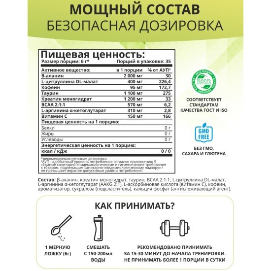 | Основные ингредиенты | BCAA / аргинин / бета-аланин / кофеин / креатин / таурин |