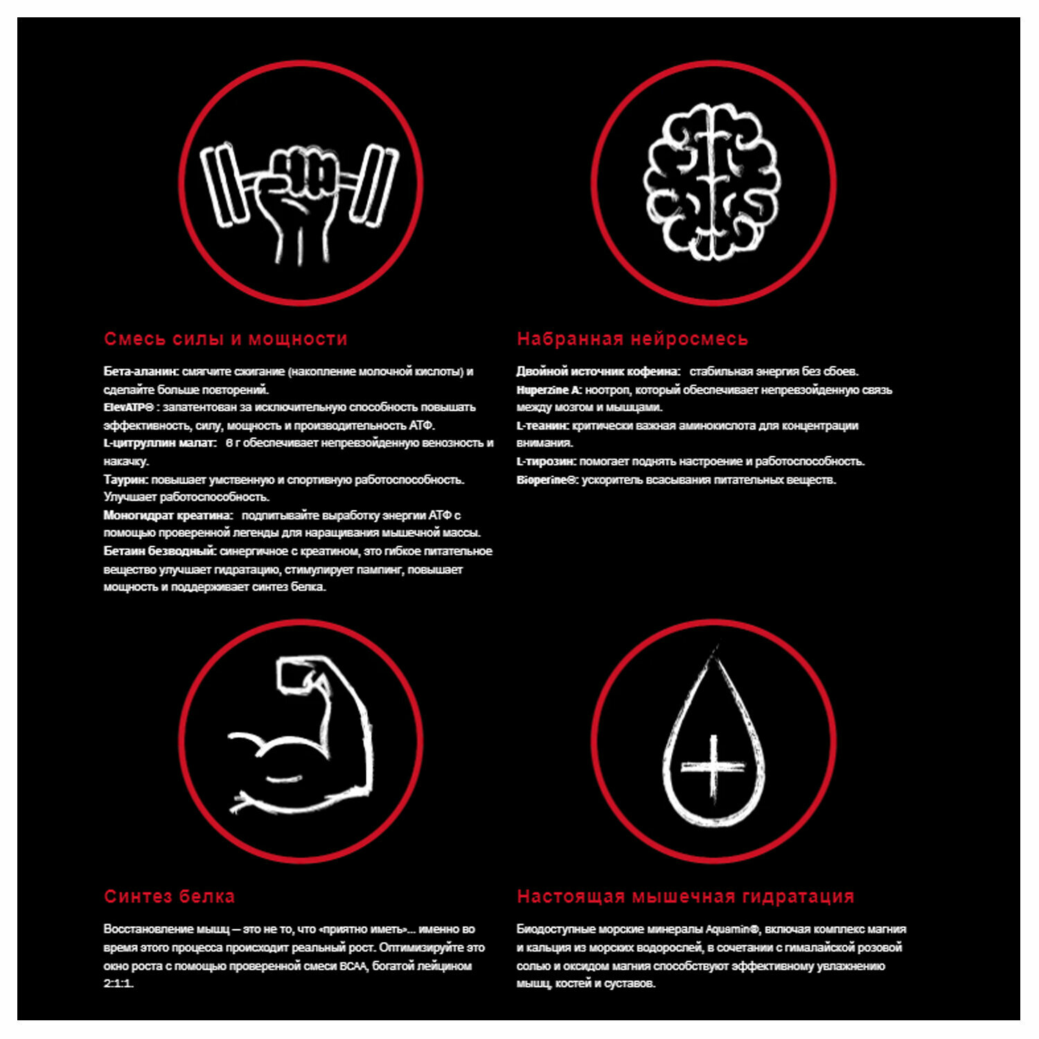 | Минусы: | Бета аланин в составе или в ничтожном количестве или его вовсе нет. Эффекта нет. Покалывание нет. От предтрена не "штырит" , нет мощного эффекта. |