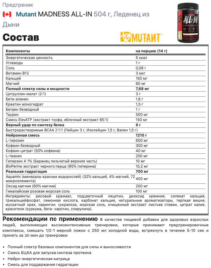СохранитьПредтренировочный комплекс MUTANT MADNESS ALL-IN 594 гр со вкусом Леденец из дыни интересное: