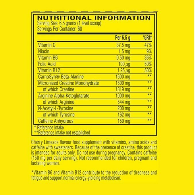| Дополнительная информация | назначение: сила энергия; рекомендации по применению: для приготовления одной порции растворите 6,5 гр добавки (1 мерная ложка) в 180-200 мл воды. Принимайте по одной порции за полчаса до тренировки; состав: 1.6 г карнозина бета-аланина 1 г креатин нитрата (NO3-T®) 150 мг кофеина 1 г аргинина (AKG); содержание жиров в 100 г: 0 г; содержание белков в 100 г: 0 г; содержание углеводов в 100 г: 1 г |