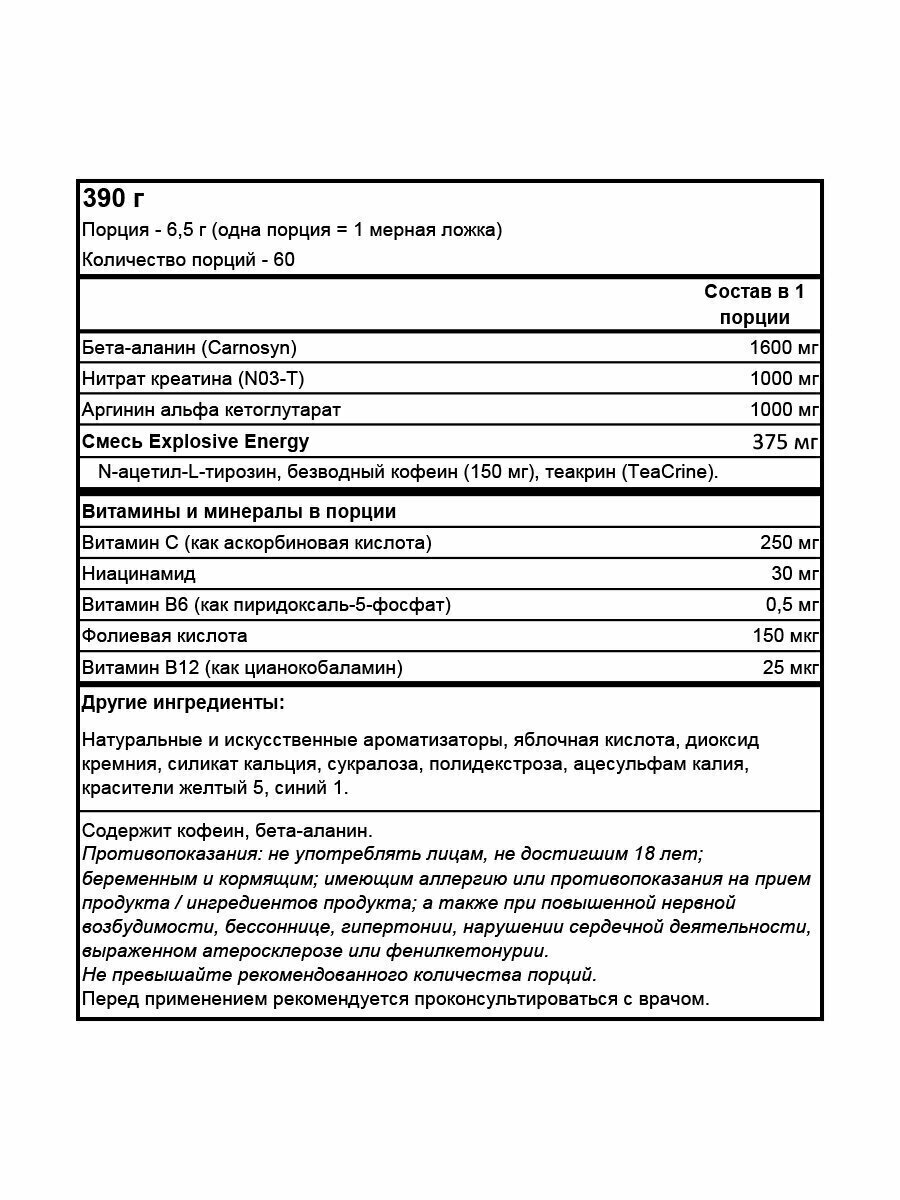 | Основные ингредиенты | BCAA / аргинин / бета-аланин / витамины и минералы / кофеин / креатин |