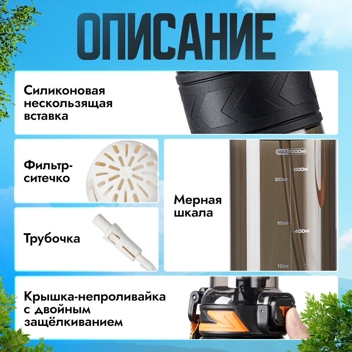 | Особенности | закрывается на замок, клапан, мерная шкала, петля для переноски, подходит для мытья в посудомоечной машине, с карабином, с ручкой, с трубочкой, силиконовая вставка на корпусе, система ношения для руки, фильтрующая сетка |