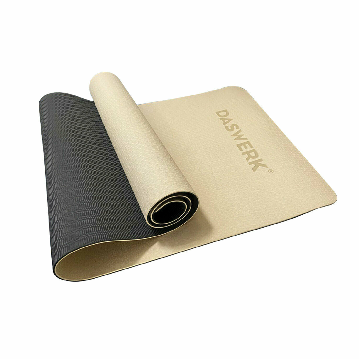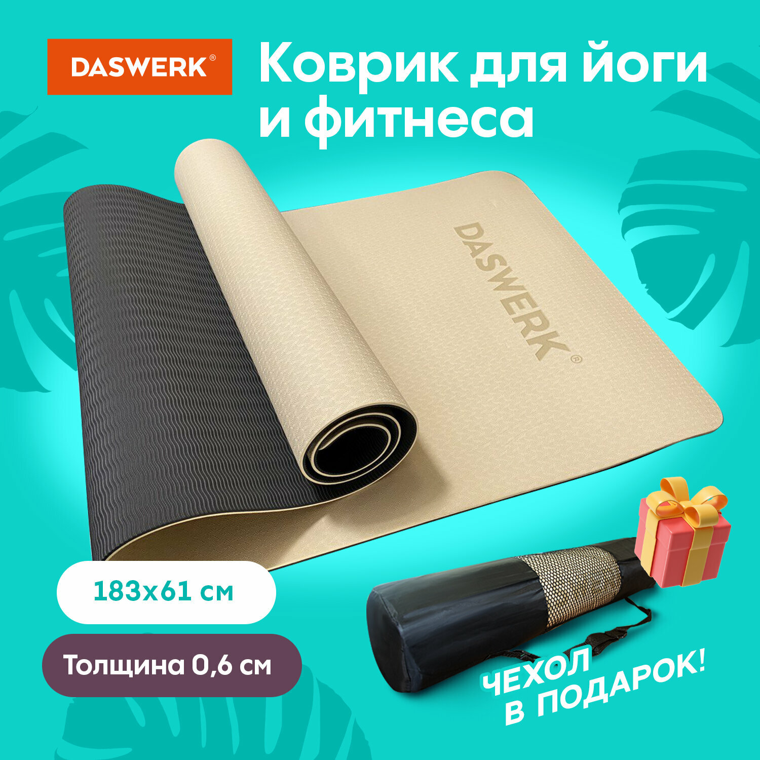 Коврик для йоги и фитнеса Daswerk спортивный двухцветный, ТПЭ, 183x61x0,6 см, бежевый/чёрный, , 680030