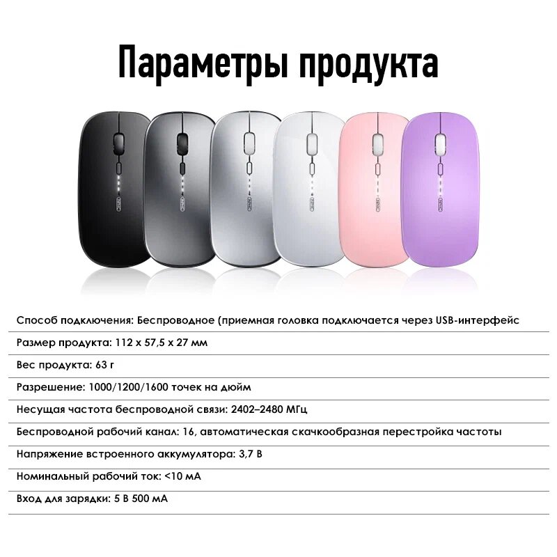 Беспроводная мышка для компьютера со встроенным аккумулятором/ Бесшумная блютуз компьютерная мышь с подсветкой RGB/ Bluetooth/ WiFi 2.4 гц
