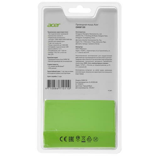 | Комплектация | [Мышь компьютерная Acer OMW130 black (3600dpi) USB(ZL.MCEEE.00J)] X 3 шт. |