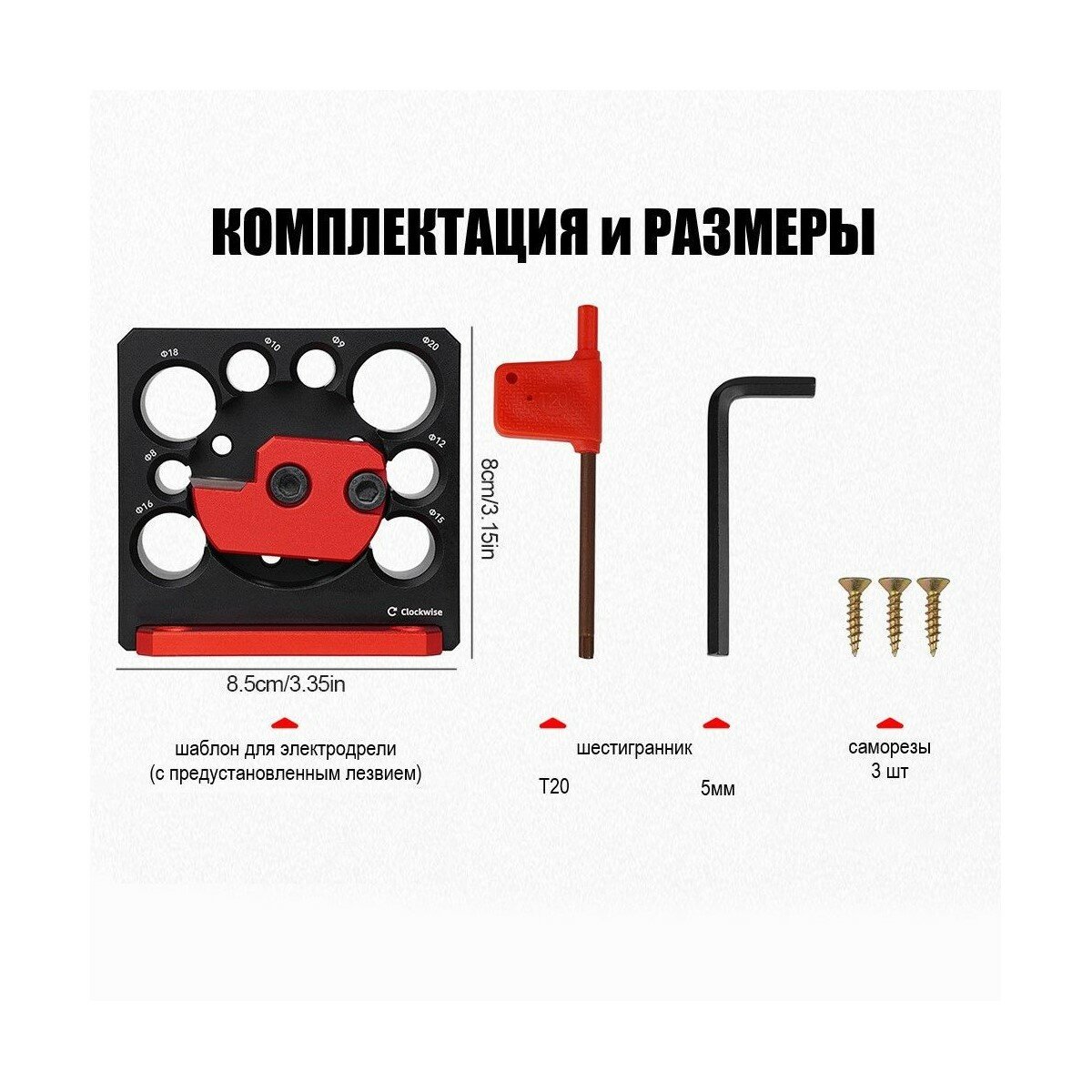 | Подробная комплектация | фиксатор для кондуктора, сверла диаметр 8/10 мм 2 шт, шестигранный ключ, сверло Форстнера диаметр15 мм, ключ для регулировки, круглые деревянные дюбеля 3 шт |