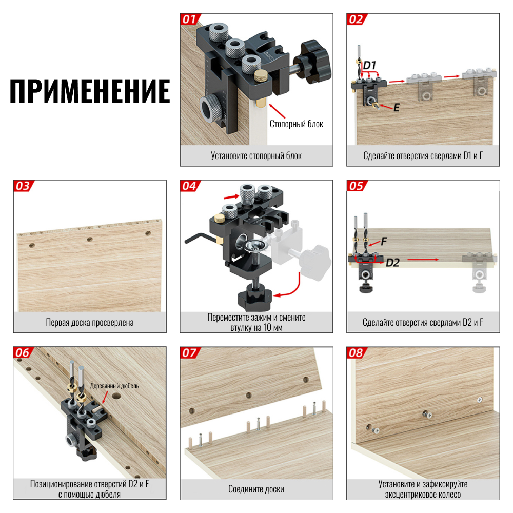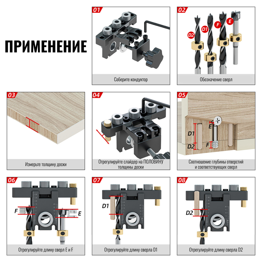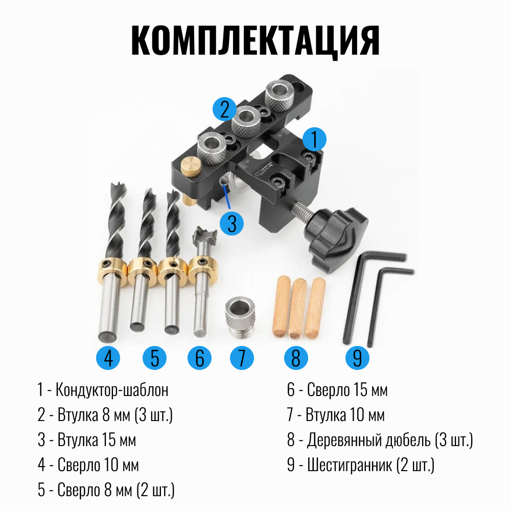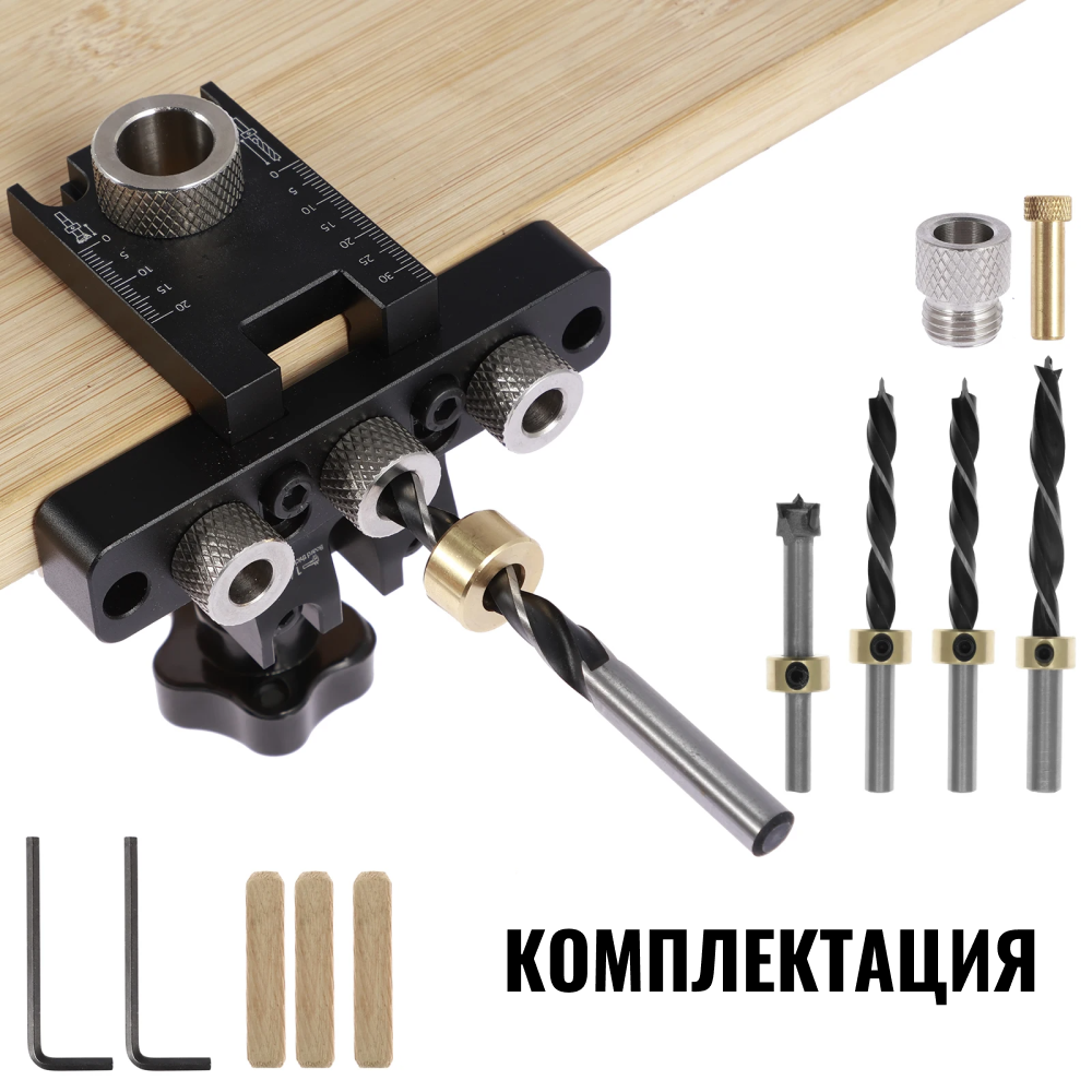 | Подробная комплектация | фиксатор для кондуктора, сверла диаметр 8/10 мм 2 шт, шестигранный ключ, сверло Форстнера диаметр15 мм, ключ для регулировки, круглые деревянные дюбеля 3 шт |