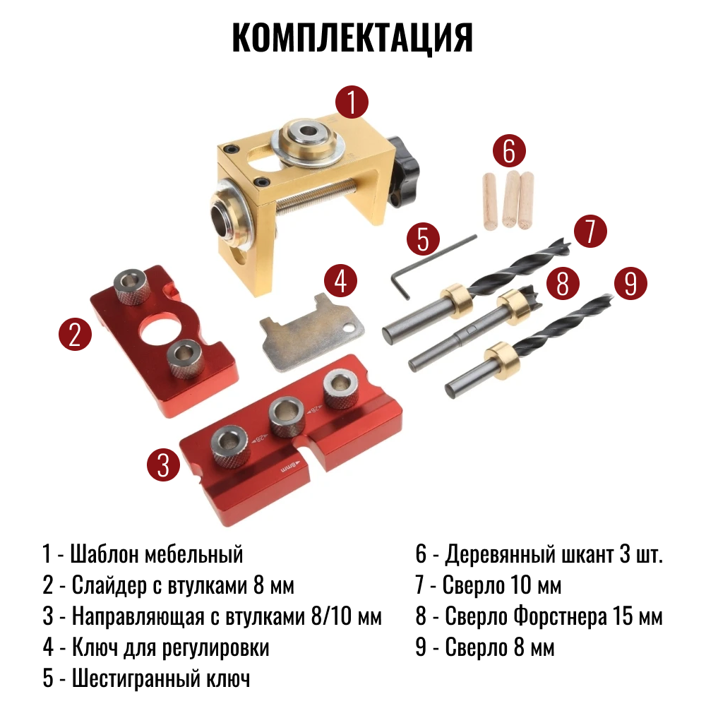 | Подробная комплектация | фиксатор для кондуктора, сверла диаметр 8/10 мм 2 шт, шестигранный ключ, сверло Форстнера диаметр15 мм, ключ для регулировки, круглые деревянные дюбеля 3 шт |