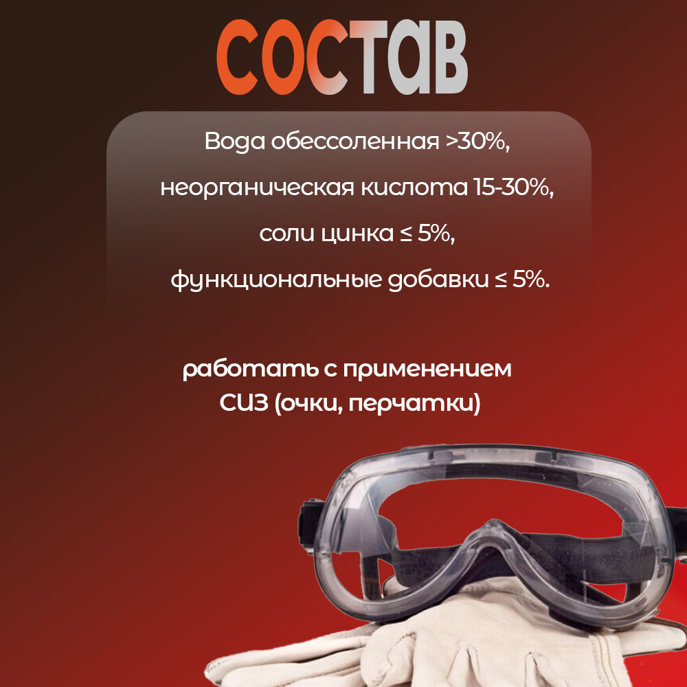 | Состав | вода ≥30%, неорганическая кислота 15-30%, соли цинка ≤5%, функциональные добавки ≤5% |