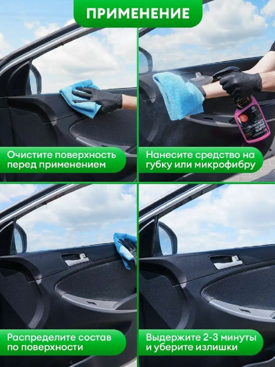 | Способ применения | Нанести на поверхность с помощью распылителя или губки и распределить равномерно по поверхности круговыми движениями. Не допускать попадания на стекла и зеркала. |