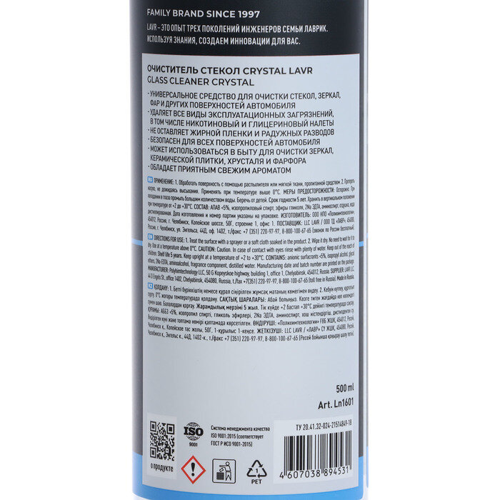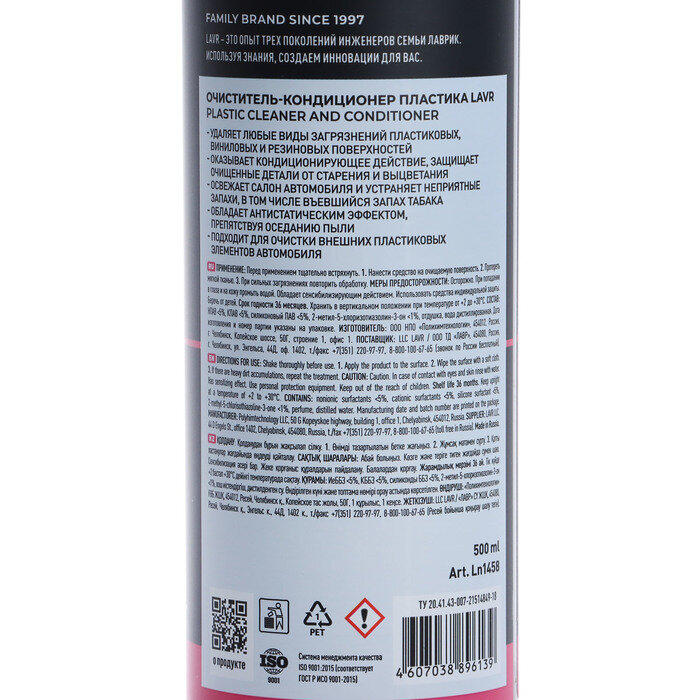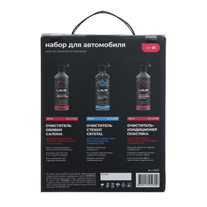 | Состав | Ln1464 Очиститель обивки салона, 500 мл. Ln1601 Очиститель стекол CRYSTAL, 500 мл. Ln1458 Очиститель-кондиционер пластика, 500 мл. |
