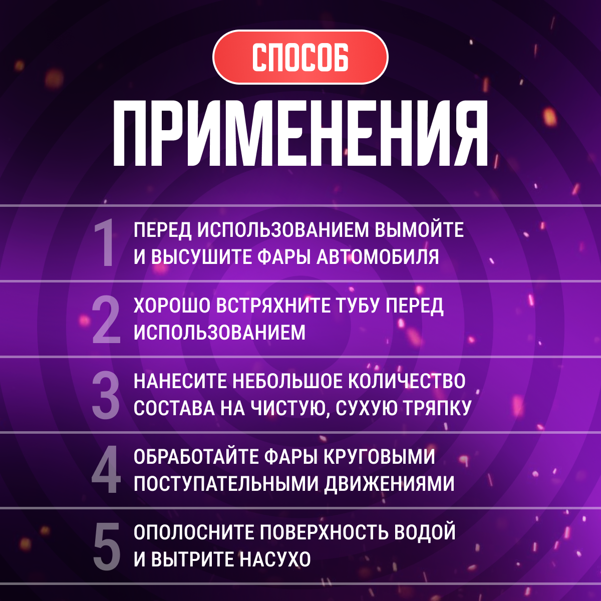| Способ применения | Перед использованием состава вымойте и высушите фары автомобиля. Хорошо встряхните тубу перед использованием. Нанесите небольшое количество состава на чистую, мягкую тряпку и обработайте поверхность фары круговыми поступательными движениями, постепенно уменьшая давление на поверхность. После обработки ополосните водой и протрите мягкой тряпкой. |