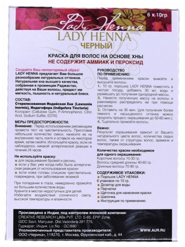 Краска для волос на основе хны "Черный" (№1) LADY HENNA 60 г