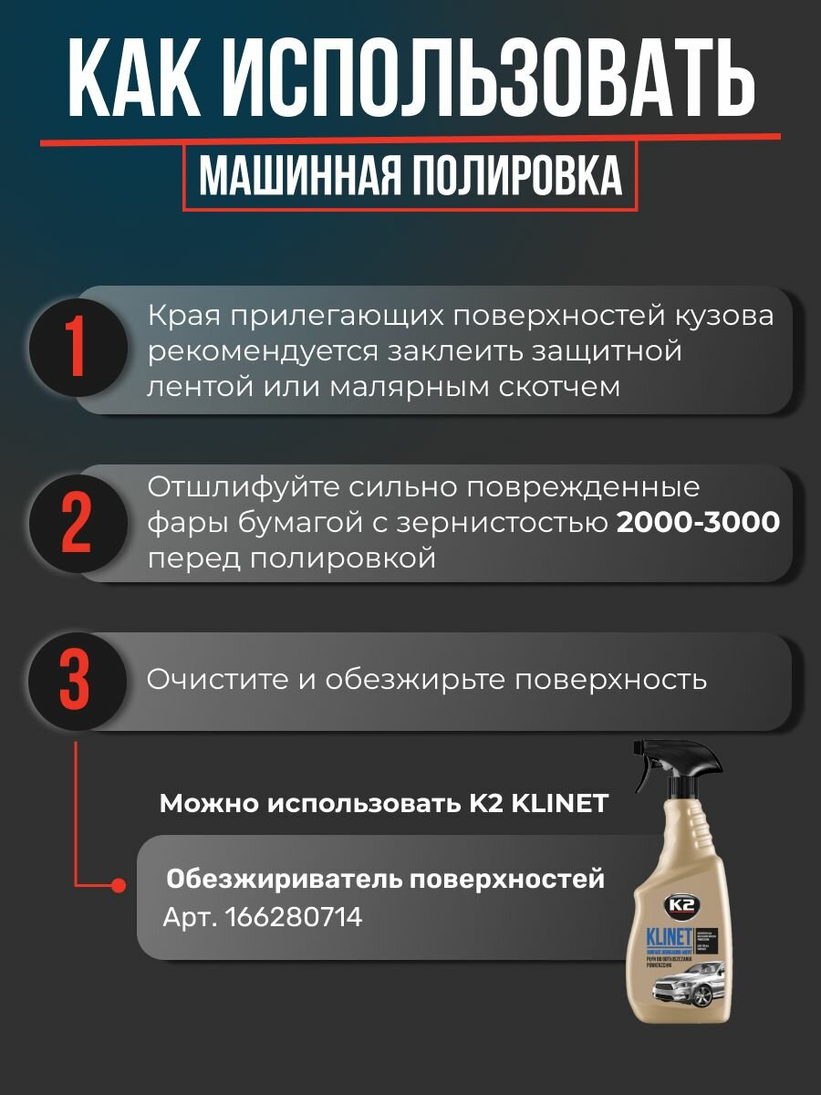 | Способ применения | Способ применения (машинная полировка): 1. Заклейте края прилегающих поверхностей защитной лентой. 2. Сильно поврежденные фары зашлифуйте перед полировкой наждачной бумагой с зернистостью 2000-3000. 3. Очистите и обезжирьте поверхность. 4. Нанесите пасту на полировальную губку (жесткость губки выбирайте по степени повреждения поверхности). 5. Распределите пасту на низкой скорости (около 600 об/мин.), а затем увеличьте скорость до 1200 об/мин. и отполируйте до блеска. 6. Очистите поверхность тканью из микрофибры. Способ применения (ручная полировка): 1. Очистите и обезжирьте поверхность. 2. Нанесите пасту губкой или микрофиброй и полируйте, пока поверхность не станет гладкой и блестящей. 3. Очистите поверхность тканью из микрофибры. |