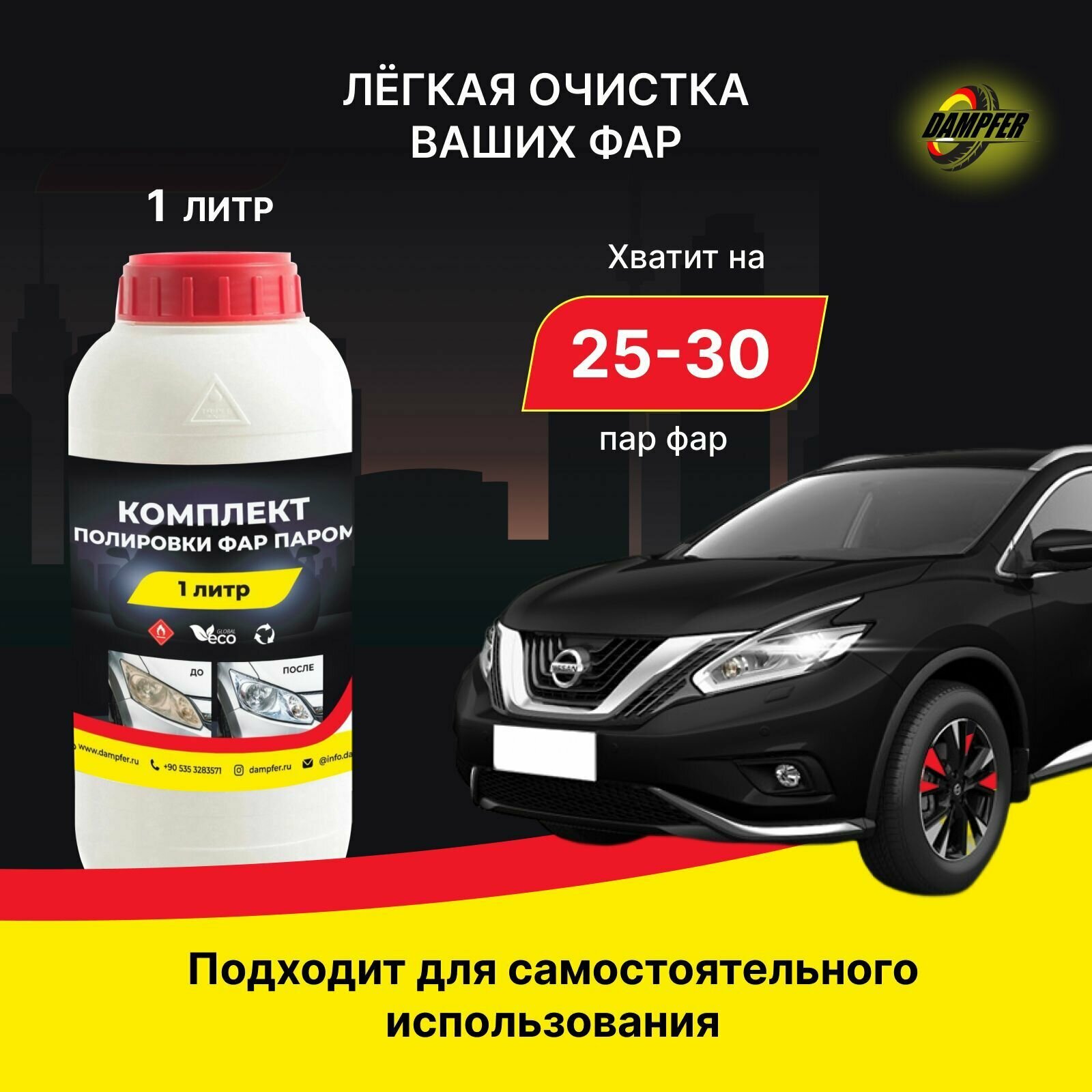 Раствор Dampfer для бесконтактной химической полировки фар паром (1 литр) / Реставратор / паровое восстановление фар интересное: