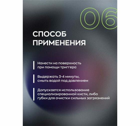 | Способ применения | Способ применения: - Перед применением тщательно очистить поверхность снаружи с помощью составов SAFE либо ECOSAFE, а затем высокопенным шампунем TOO SHAMPOO с использованием специализированной губки. - Наносить только на остывшую поверхность колёсных дисков и кузова. - Спустя 3-4 минуты смыть водой под давлением (возможна выдержка 5-10 минут для сильно загрязненных дисков). - В случае необходимости возможно использование специализированной кисти либо губки для очистки сложных загрязнений колесных дисков. |