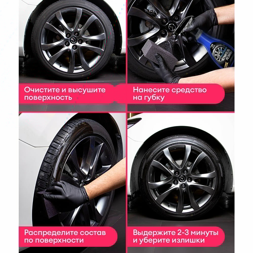 | Действие | восстановление первоначального цвета поверхности шины / защита от ультрафиолета / придание блеска / придание водоотталкивающих свойств / чернение шин |