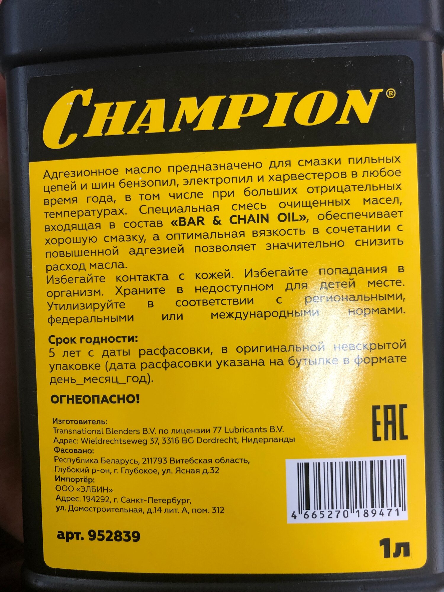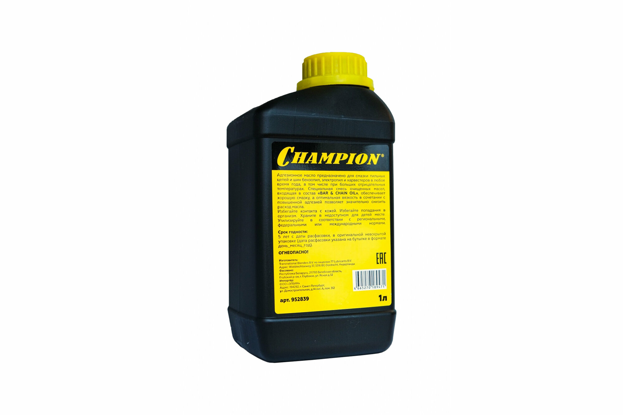 | Дополнительная информация | Масло для смазки цепи CHAMPION Bar & Chain Oil 1 л |