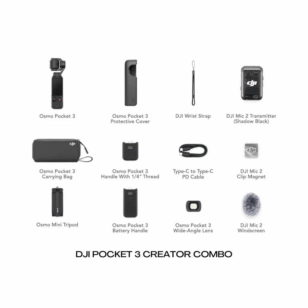 | Комплектация | Кабель PD Type-C to Type-C; Защитный чехол для Osmo Pocket; Ремешок DJI на запястье; Ручка Osmo Pocket 3 с резьбой 1/4″; Широкоугольный объектив Osmo Pocket 3; Передатчик DJI Mic 2 (черный оттенок); DJI Mic 2 защита от ветра; Магнитный зажим DJI Mic 2; Аккумуляторная ручка Osmo Pocket 3; Мини-штатив Osmo; Сумка для переноски Osmo Pocket; |
