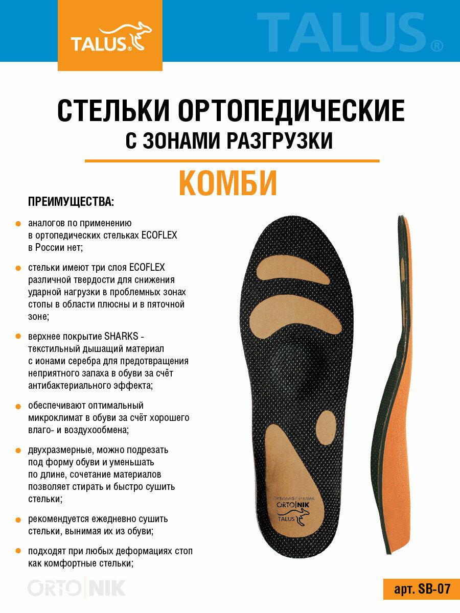 Стельки ортопедические с зонами разгрузки Комби Talus SB07, в спортивную обувь, бескаркасные, мягкие, размер 41-42
