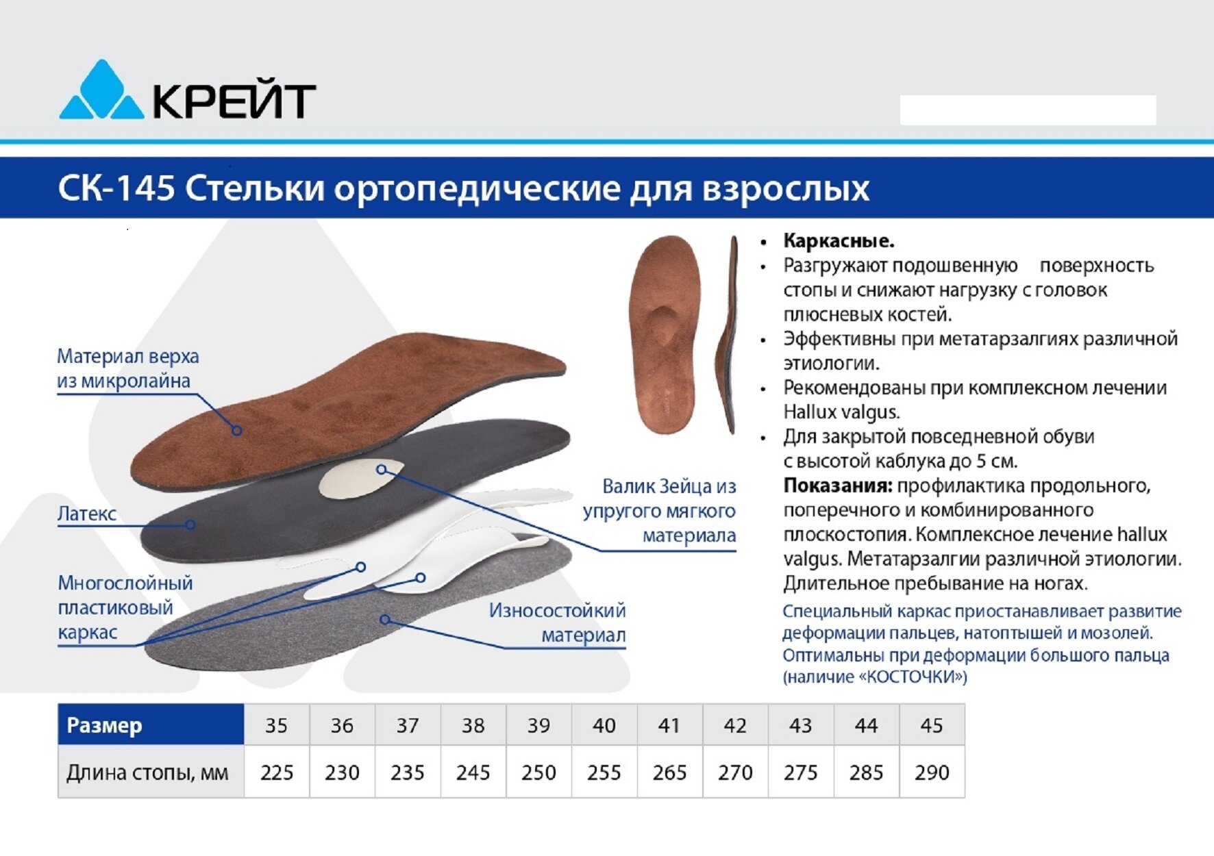 | Показания | вальгусная деформация / натоптыши / повышенная нагрузка на ноги / поперечное плоскостопие / продольно-поперечное плоскостопие / продольное плоскостопие |