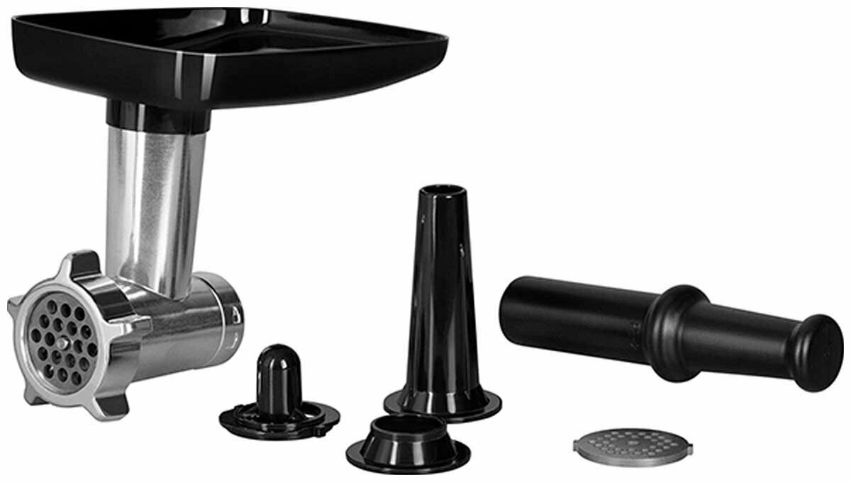 | Комплектация | насадка для приготовления колбасок, загрузочный лоток, основание насадки для кеббе и колбасок, толкатель, перфорированные диски для фарша (2 шт.), насадка-мясорубка, насадка для приготовления кеббе |
