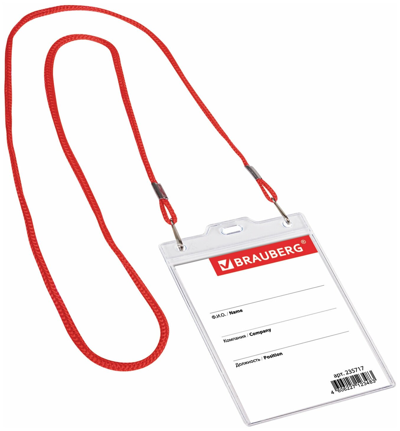 Купить Бейдж для пропуска на ленте пластиковый прозрачный вертикальный 120х90 мм, бейджик на красном шнурке 45 см в школу, 2 карабина, Brauberg, 235717
