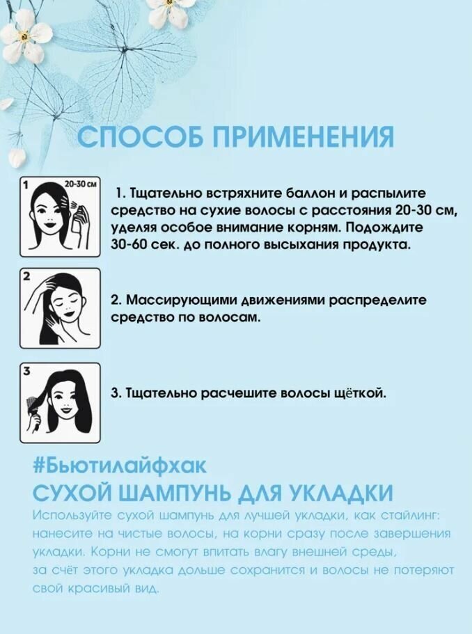 | Способ применения | тщательно встряхните баллон и распылите средство на сухие волосы с расстояния 20-30 см, уделяя особое внимание корням. Подождите 30-60 сек, затем массирующими движениями распределите средство по волосам. Тщательно расчешите волосы щеткой |