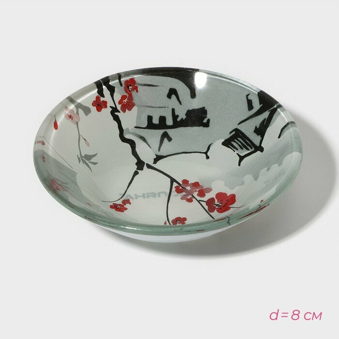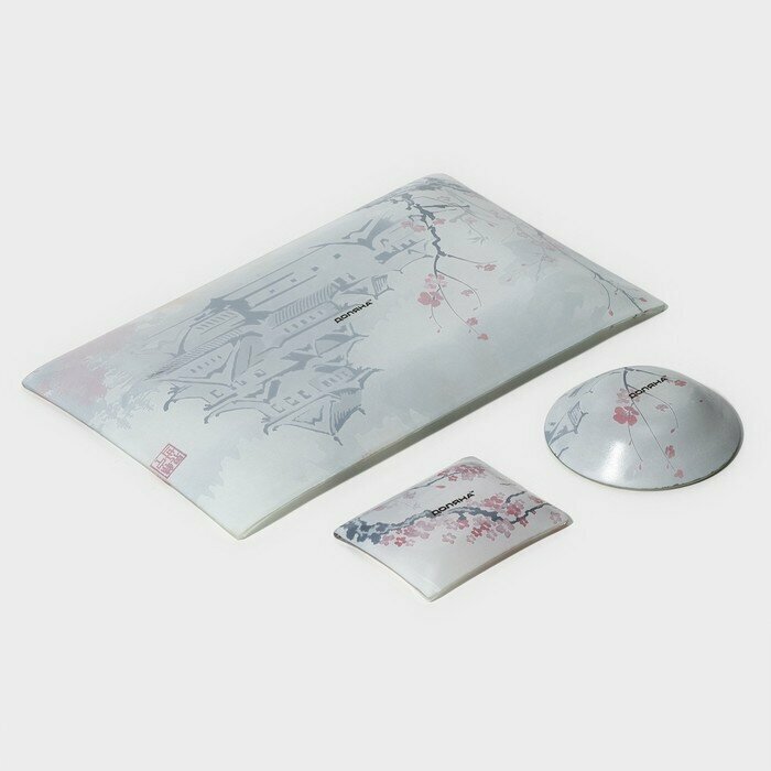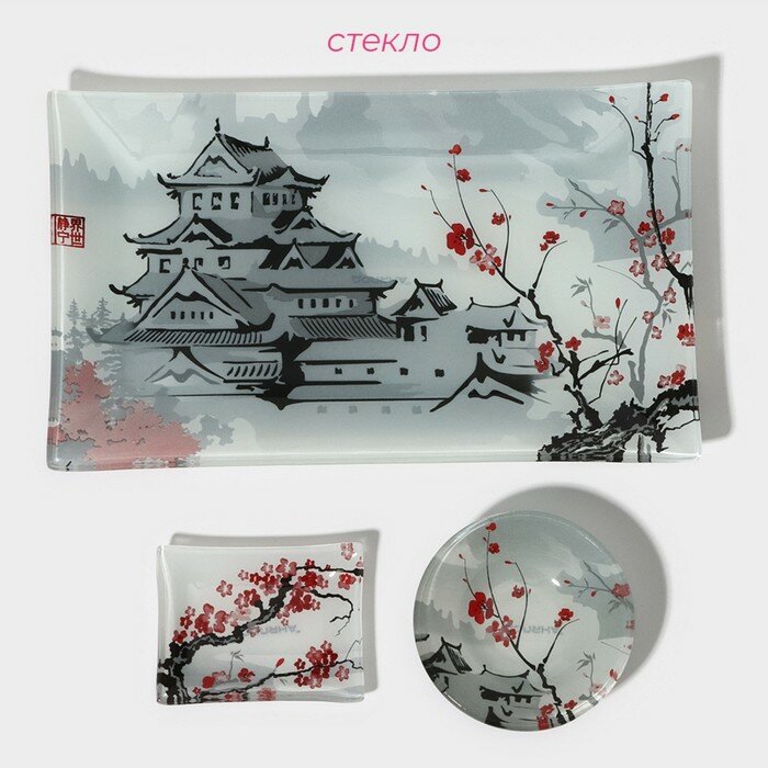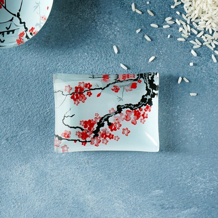 Набор для суши из стекла Доляна «Сакура», 3 предмета: соусники 8×2 см, 8×6 см, подставка 25×15×2 см