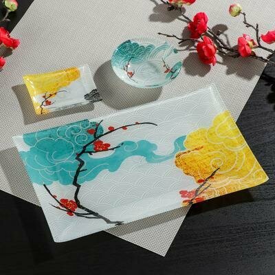 Набор для суши из стекла Доляна «Сакура», 3 предмета: соусники 8×2 см, 8×6 см, подставка 25×15×2 см