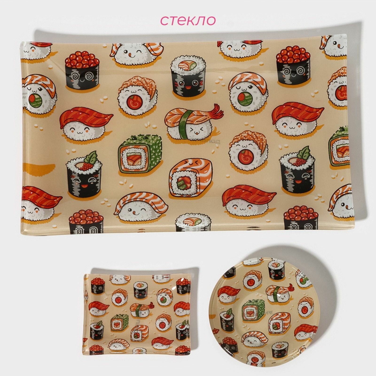 СохранитьДоляна Набор для суши из стекла Доляна «Сет», 3 предмета: соусники 8×2 см, 8×6 см, подставка 25×15×2 см интересное: