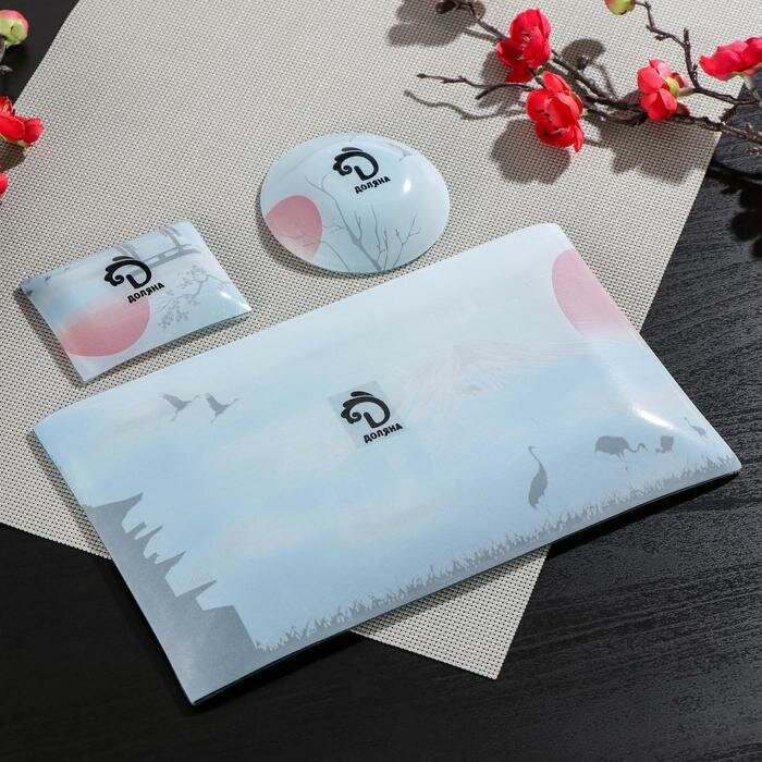 Купить Набор для суши из стекла Доляна «Журавль», 3 предмета: соусники 8×2 см, 8×6 см, подставка 25×15×2 см