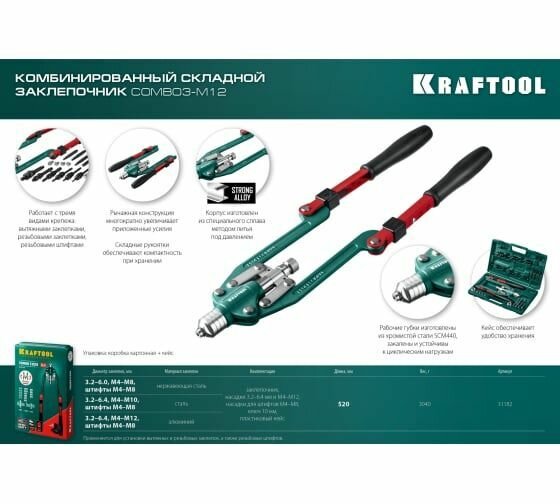 Заклепочник Kraftool Combo3-M12 комбинированный заклепочник складной в кейсе 31182_z01 интересное: