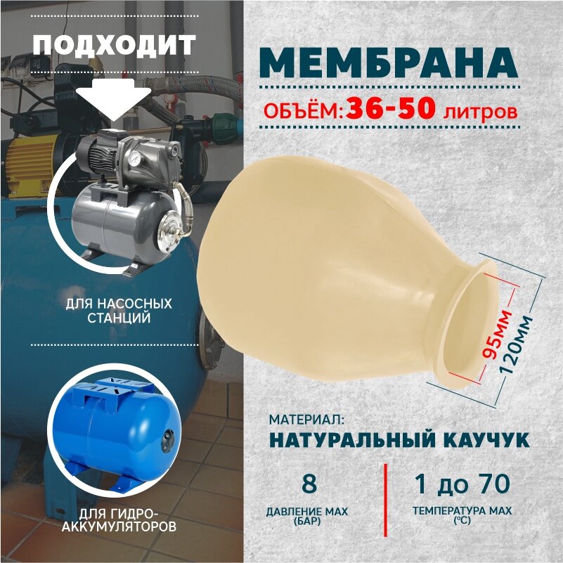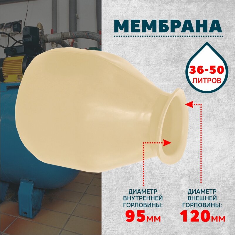 | Дополнительная информация | Мембрана для гидроаккумуляторов и насосной станции 36-50 литров, белая. |