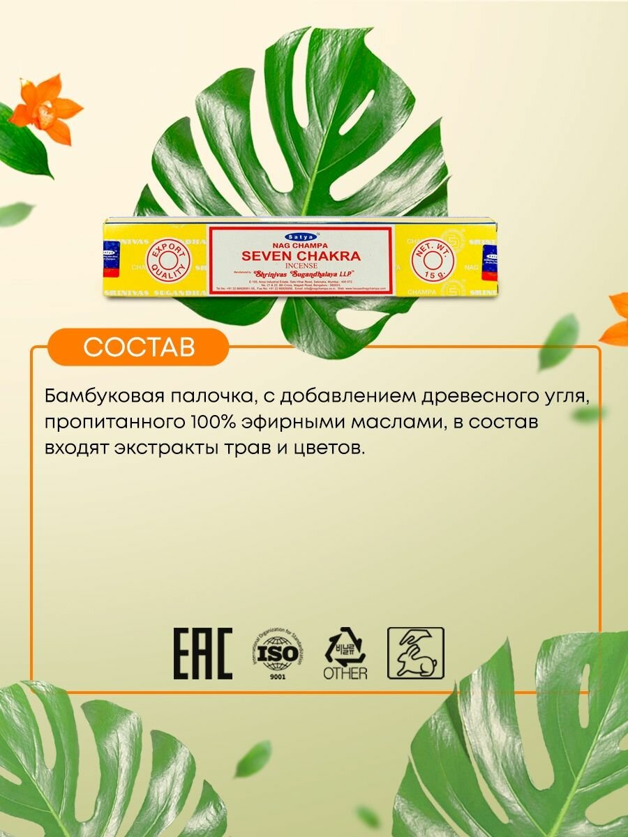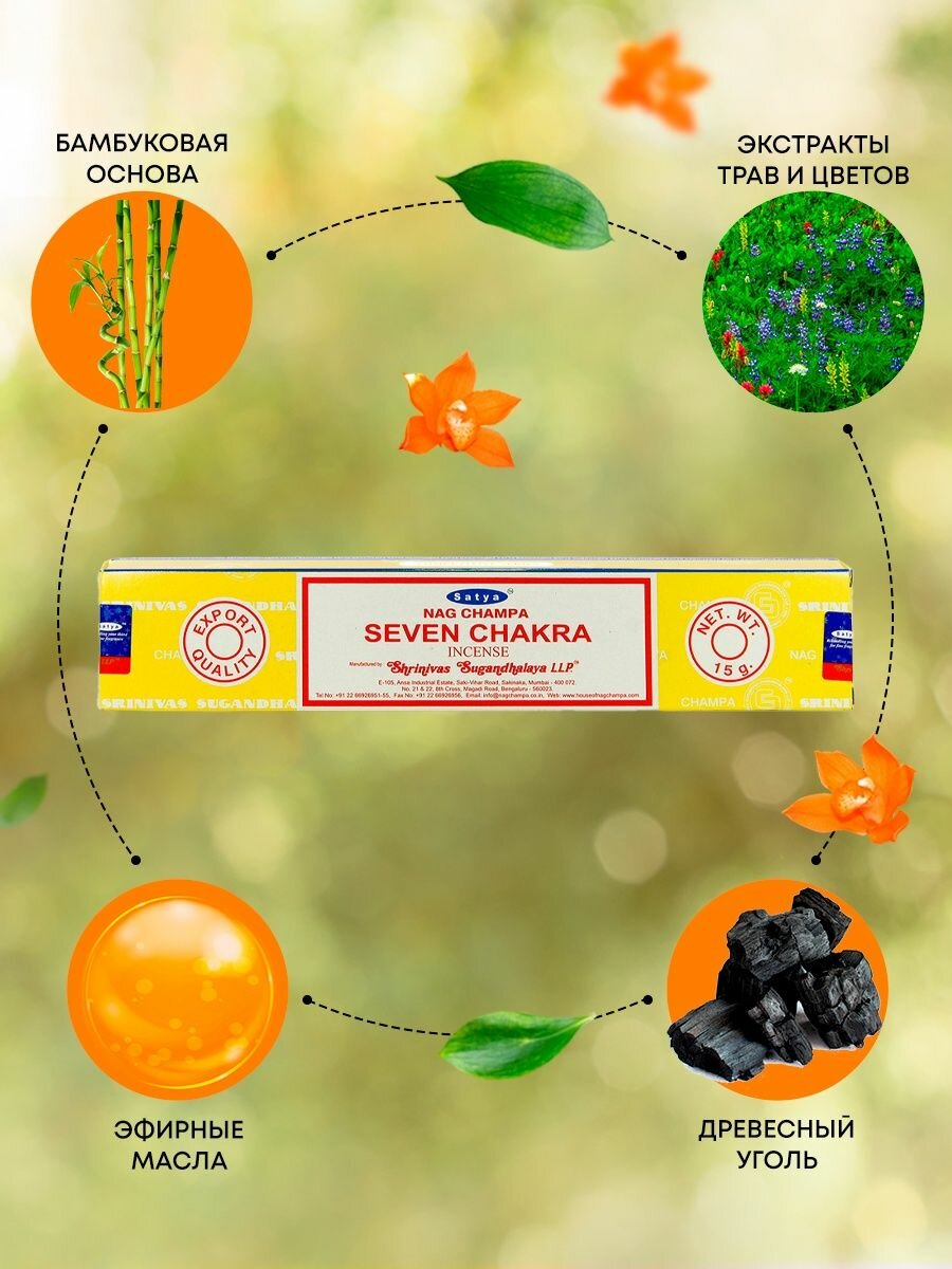 Купить Благовония Сатья Семь Чакр, ароматические палочки, индийские, для дома, медитации,Satya Seven Chakra, 15г