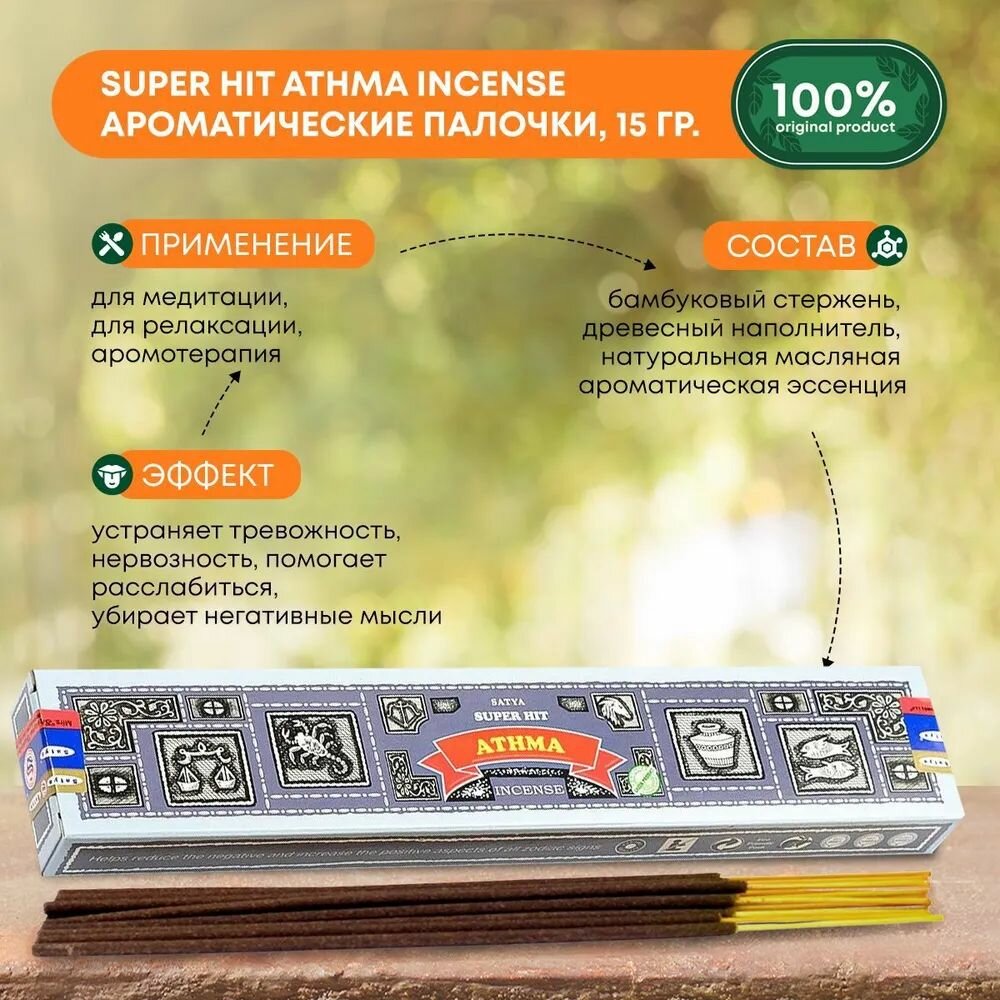 Благовония Super Hit Athma Incense (Супер Хит Атма) Ароматические индийские палочки для дома, йоги и медитации, Satya (Сатья), 15г