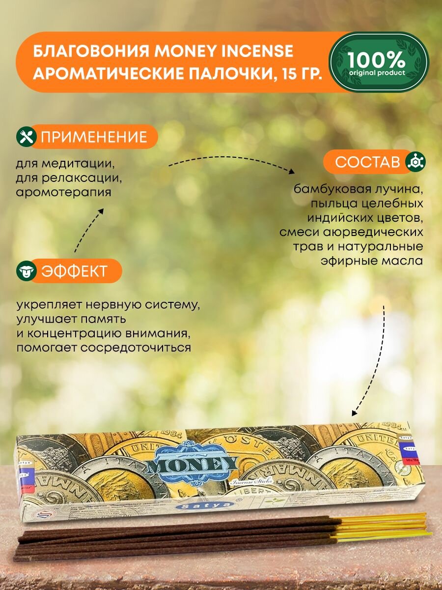 СохранитьБлаговония Money Incense (Деньги) Ароматические индийские палочки для дома, йоги и медитации, Satya (Сатья), 15г интересное: