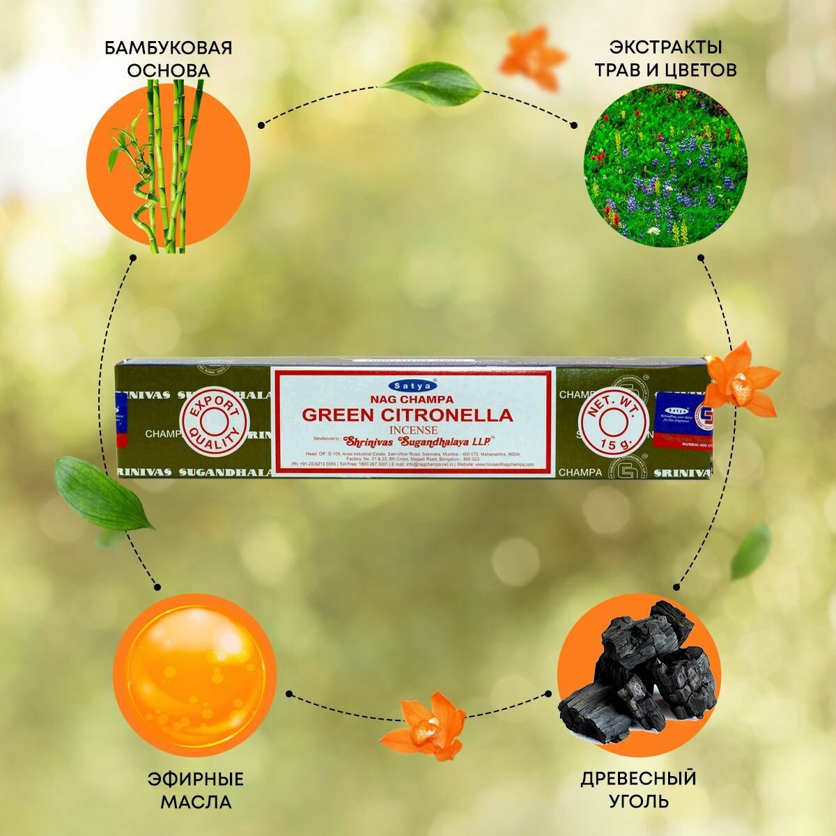 Купить Благовония Satya Green Citronella, Сатья Зеленая Цитронелла, ароматические палочки, индийские, для дома, медитации, 15г