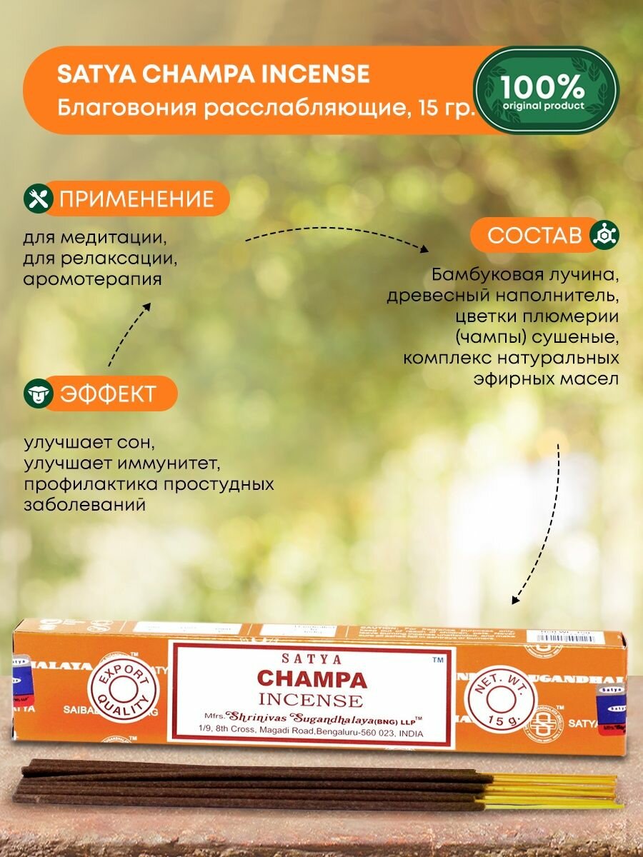 Купить Благовония расслабляющие Champa INCENSE Ароматические индийские палочки для дома, йоги и медитации, Satya (Сатья), 15г