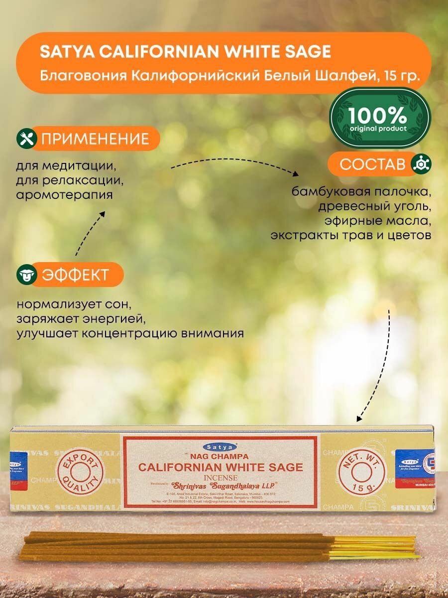 Купить Благовония палочки ароматические индийские "Калифорнийский Белый шалфей" индийские для медитации дома, Satya Californian White Sage, 15г